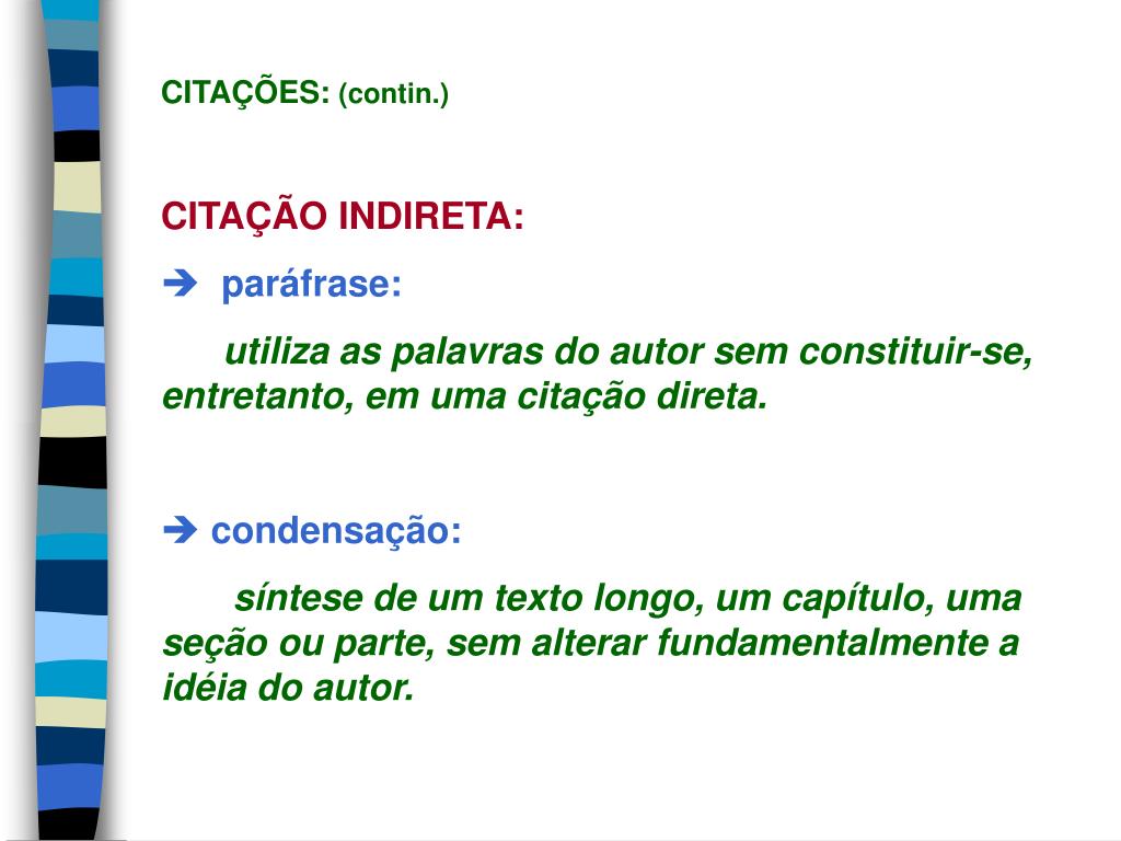 Ao contrário da citação direta, a citação indireta deve ser encorajada pois é a maneira que o pesquisador tem de ler, compreender e gerar conhecimento a partir do conhecimento de outros autores.. A paráfrase é um exemplo de ferramenta textual utilizada onde não é adicionada nenhuma informação adicional em relação à temática original. A citação é um dos recursos mais importantes na língua brasileiro ou em qualquer outro tipo de recuso, é por meio da citação que conseguimos ter uma. É a transcrição das idéias de um autor usando suas próprias palavras. 19/10/2021 22/07/2019 por beatriz coelho.. Entre a citação e os parágrafos anterior e posterior.